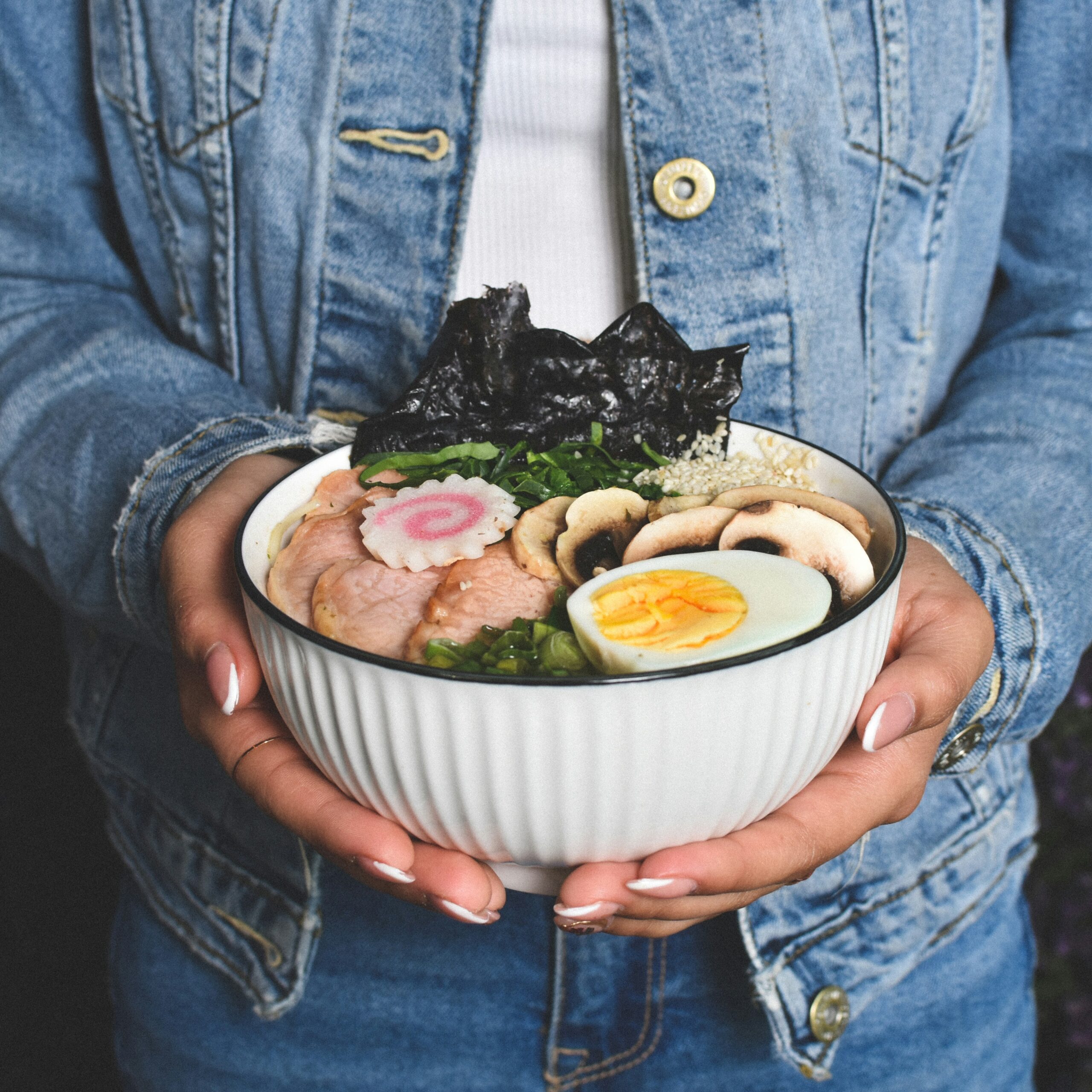 - Divide noodles into bowls, pour hot broth, add protein, eggs, and toppings.